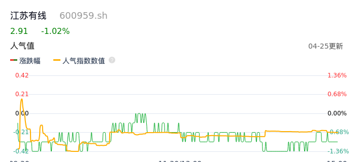 04月25日,江苏有线收报2.91,股价涨幅-1.02%,成交金额7497.26万元,换手率0.51%。