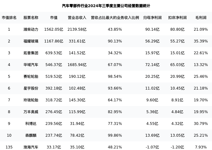 渤海汽车最新报告期数据为三季度,下表汇总了汽车零部件行业内市值靠前的公司三季度主要经营数据