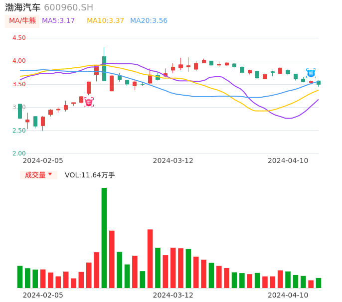 04月10日,渤海汽车收报3.49,股价涨幅-1.97%,成交金额4075.32万元,换手率1.22%。