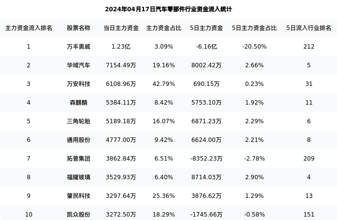 从主力资金流向来看,汽车零部件行业今日主力资金流入89.52亿元,在所有申万二级行业中排名:120/131。