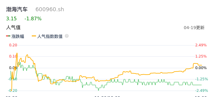 04月19日,渤海汽车收报3.15,股价涨幅-1.87%,成交金额3728.85万元,换手率1.24%。