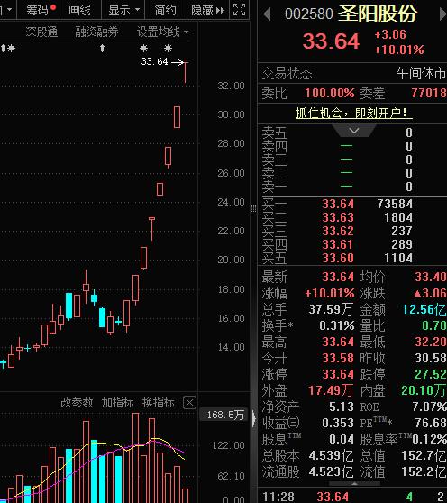 4月20日早盘,圣阳股份(002580)大幅高开,盘中短暂回落后再次回封,截至上午收盘,该股涨停板封单近7.36万手,最新收盘价创历史新高。至此,该股已连续收获8个涨停板,是同期连续涨停次数最多的股票。