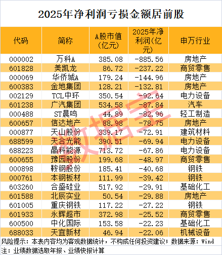 2025年年报披露已进入高峰期,业绩亏损股浮出水面。据证券时报·数据宝统计,不含今年新上市的股票,截至目前,已披露年报、业绩快报的股票中(暂时不包括业绩预告),2025年净利润亏损的有560余只,其中4股亏损金额超100亿元,分别是万科A、美凯龙、华侨城A、金地集团,这些公司均受到房地产市场下行的影响。