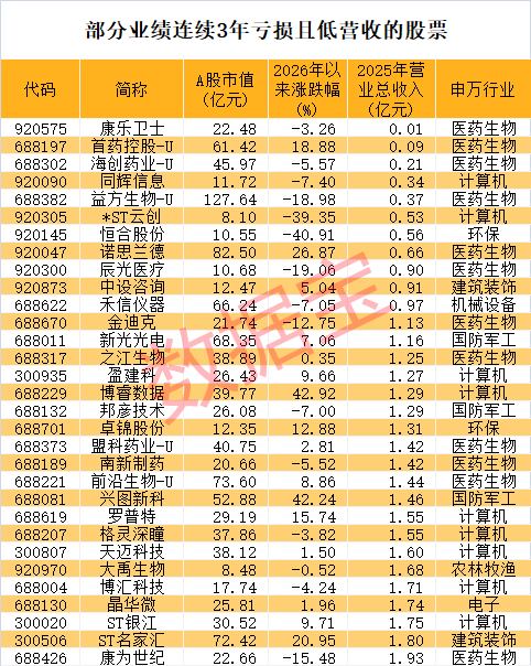 从更长周期来看,部分股票净利润连续3年呈现亏损。据数据宝统计,上市日期在2024年以前的股票中,2023年—2025年净利润连续亏损(注:2025年净利润取年报或业绩快报数据)的有236家。这些公司不仅业绩连续亏损,营收规模也处于低水平。