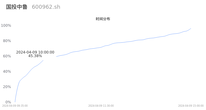 600962国投中鲁2024年04月09日成交5.74万手,成交金额5867.54万元,相较昨日缩量2.83万手,换手率2.19%,成交清淡。