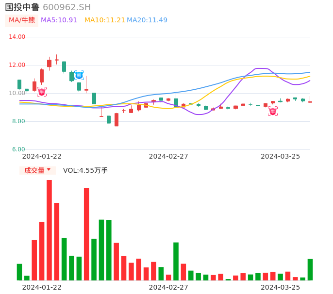 03月25日,国投中鲁收报9.40,股价涨幅-0.42%,成交金额4333.80万元,换手率1.73%。