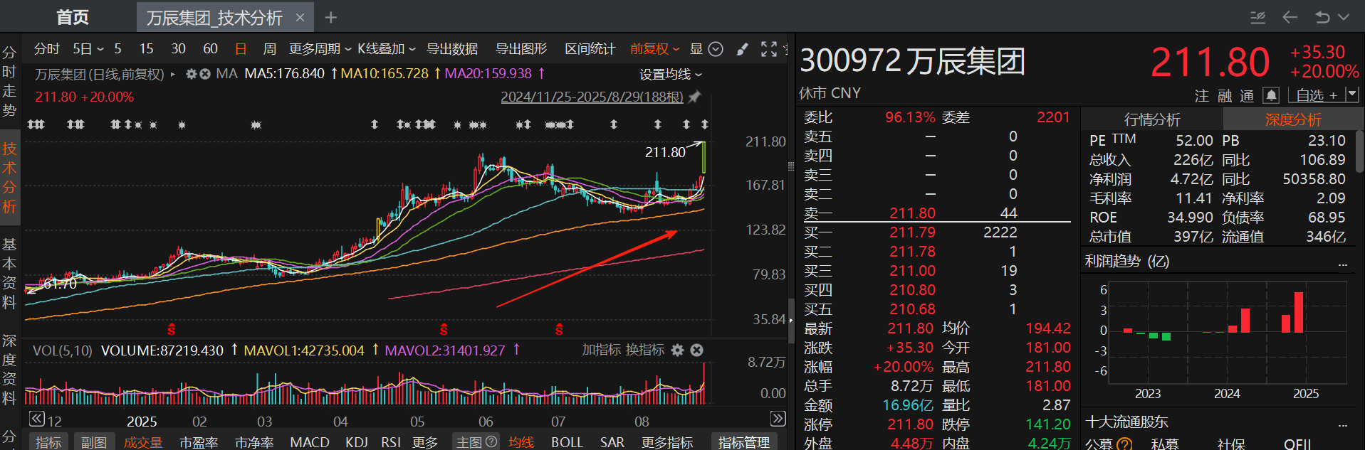 量贩零食龙头万辰集团月内股价累计最大涨幅为50.21%。万辰集团8月11日公告,公司拟以支付现金方式,向淮南市盛裕企业管理有限公司和淮南市会想企业管理有限公司购买南京万优商业管理有限公司(简称“南京万优”)49%股权,交易价13.79亿元。同时,为加强核心团队成员与公司的绑定,公司此次以支付现金方式购买南京万优股权的同时,拟由福建农开发、漳州金万辰、王泽宁、张海国向淮南盛裕实控人周鹏转让上市公司989万股股份(占公司总股本的5.27%)。万辰集团称,此次交易前,公司通过南京万品商业管理有限公司间接控制南京万优商业管理有限公司51%股权,此次交易系公司收购控股子公司的少数股权,交易完成后,公司直接和间接持有南京万优75.01%的股权。