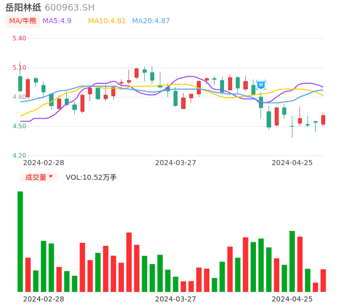 04月25日,岳阳林纸收报4.61,股价涨幅1.54%,成交金额4837.68万元,换手率0.59%。