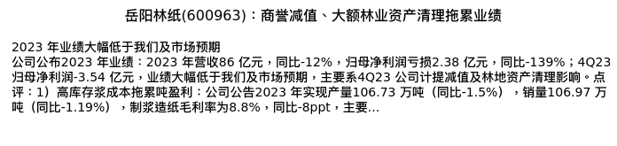 值得注意的是:2024年04月中金公司的龚晴/陈彦/杨茂达/刘嘉忱/姚旭东分析师,首次发布关于岳阳林纸的研究报告,标题为:岳阳林纸(600963):商誉减值、大额林业资产清理拖累业绩。