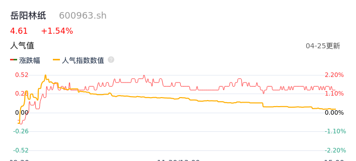 04月25日,岳阳林纸收报4.61,股价涨幅1.54%,成交金额4837.68万元,换手率0.59%。