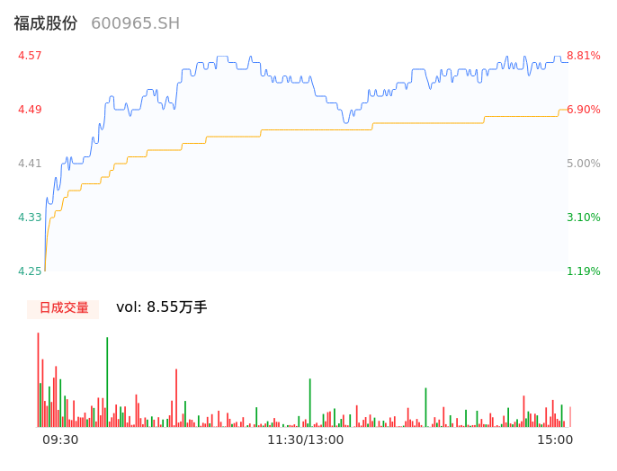 04月17日,福成股份收报4.56,股价涨幅8.57%,成交金额3837.58万元,换手率1.04%。