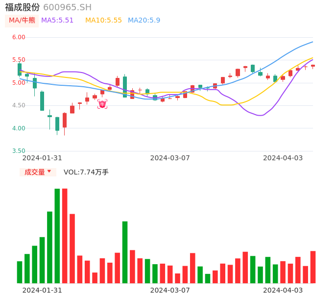 04月03日,福成股份收报5.39,股价涨幅0.75%,成交金额4149.11万元,换手率0.95%。