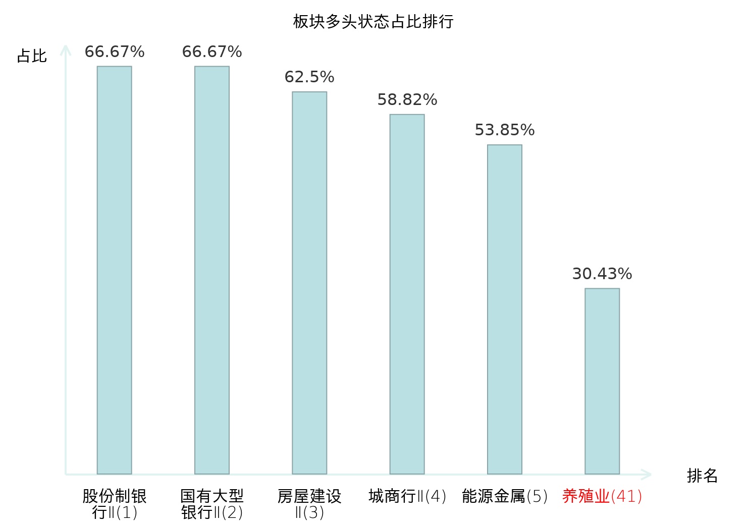 全市场所有行业板块中主力多头状态占比排名中,股份制银行Ⅱ板块位居第一。航空机场板块名次提升最快,较昨日上升68位。