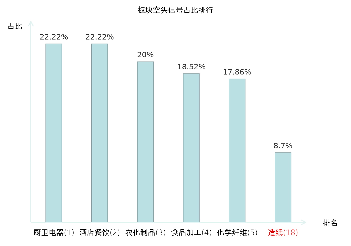 全市场所有行业板块中主力空头信号占比排名中,厨卫电器板块位居第一。化学纤维板块名次提升最快,较昨日上升119位。