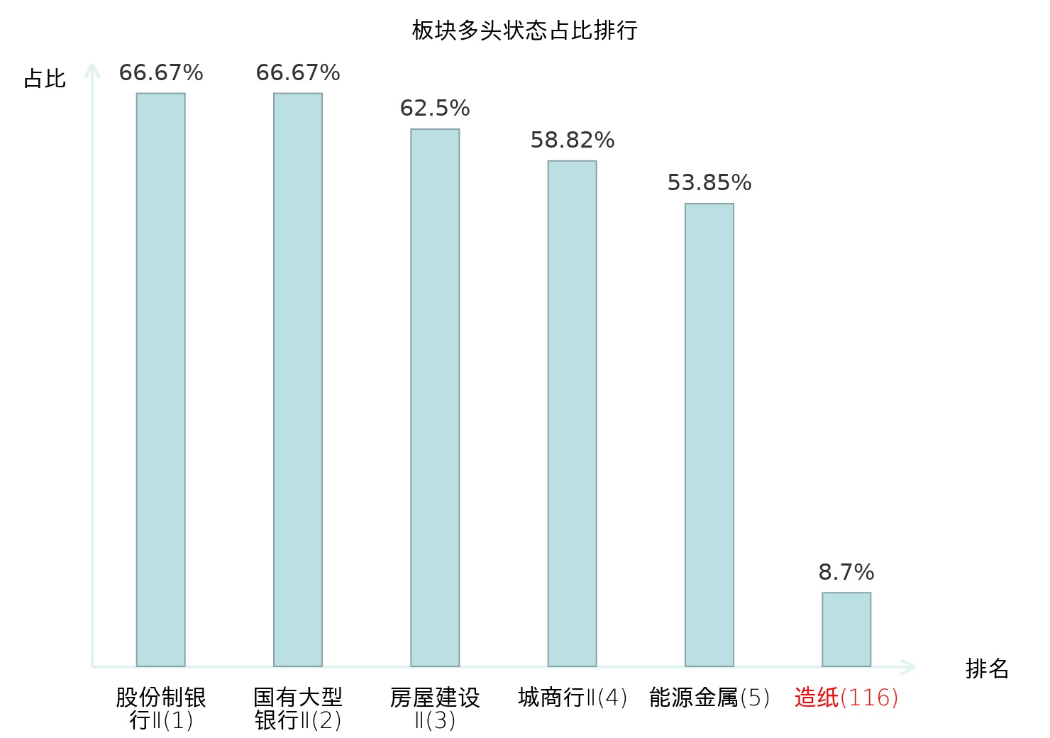 全市场所有行业板块中主力多头状态占比排名中,股份制银行Ⅱ板块位居第一。航空机场板块名次提升最快,较昨日上升68位。