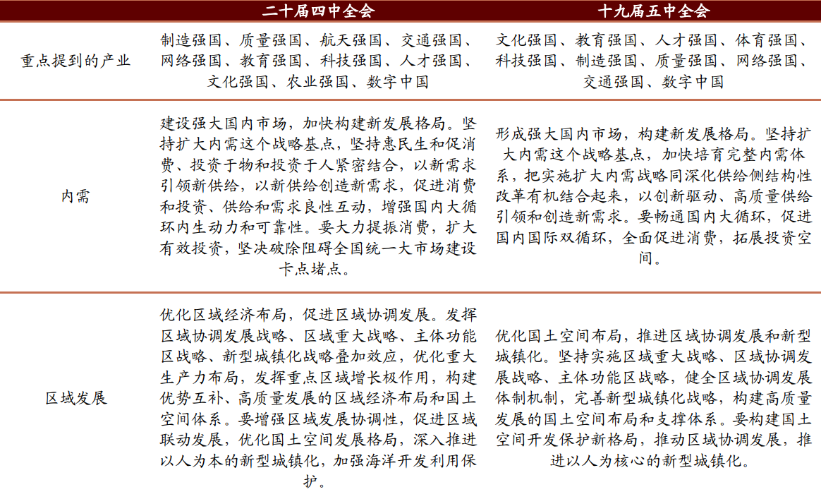 本次“十五五”规划行业层面重点关注:1)建设现代化体系仍然排在第一位,高新技术制造业的发展和升级重要性凸显;2)对科技、消费的提及有所增加,加快高水平科技自主自强,引领发展新质生产力,科技自主可控仍然是续 发展的重点;3)扩内需方面,提到了“坚持惠民生和促消费、投资于物和投资于人紧密结合”,对“统一大市场”的措辞更加坚决,并且消费排在第三位,后续在统一大市场的建设和扩内需方面有望出台更多支持政策。4)新增航天强国、农业强国的目标,体现对太空经济的重视。后续重点关注对电子、计算机、通信、国防军工、机械、电力设备、食品饮料、社会服务等领域的催化。