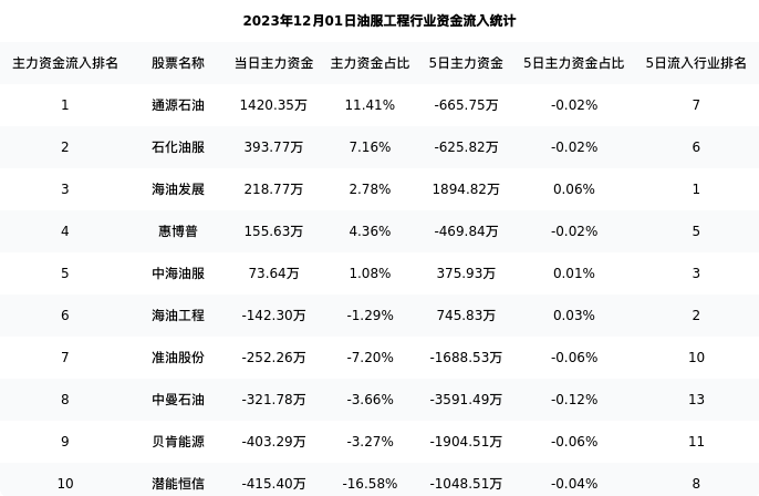 从主力资金流向来看,油服工程行业今日主力资金流入1.92亿元,在所有申万二级行业中排名:37/131。