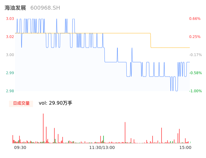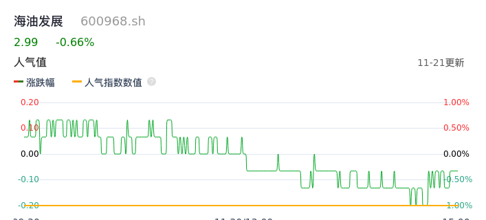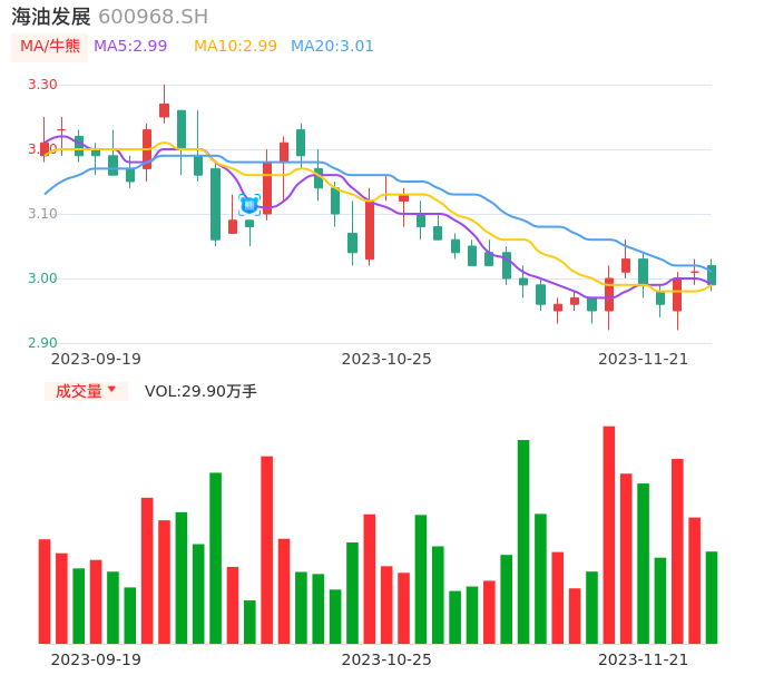 11月21日,海油发展收报2.99,股价涨幅-0.66%,成交金额8996.34万元,换手率0.29%。