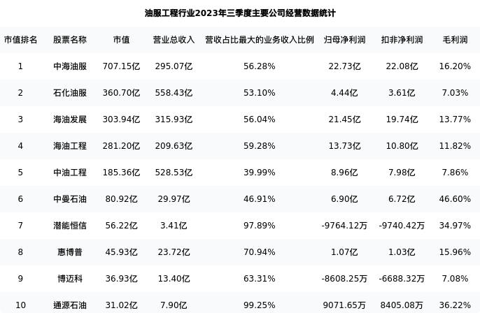 海油发展最新报告期数据为三季度,下表汇总了油服工程行业内市值靠前的公司三季度主要经营数据
