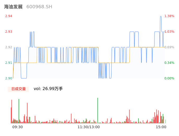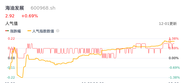 12月01日,海油发展收报2.92,股价涨幅0.69%,成交金额7875.14万元,换手率0.27%。
