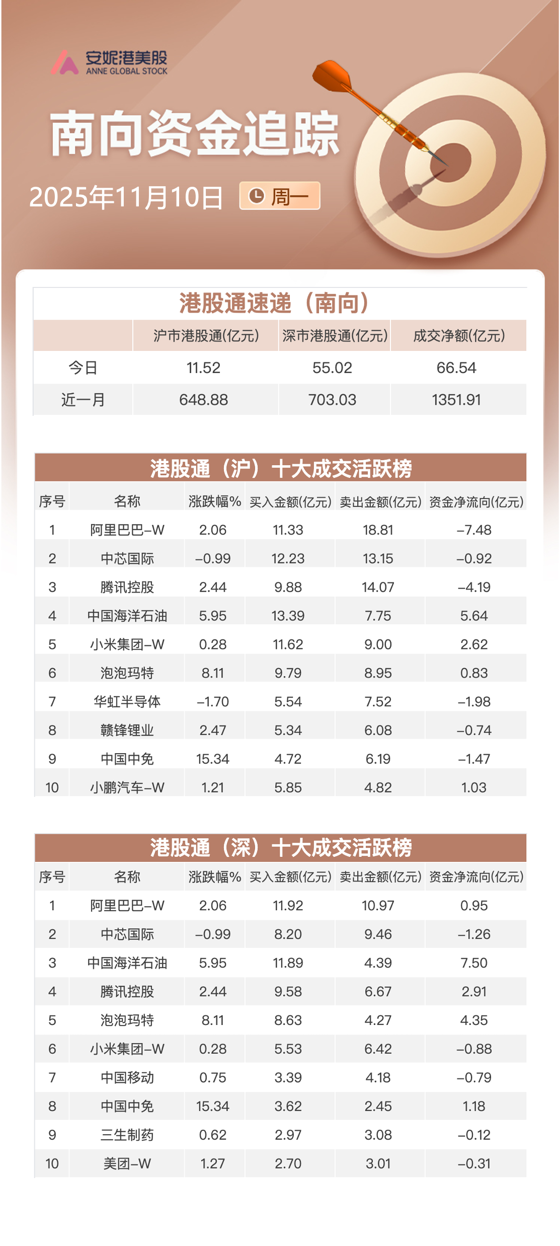 恒指今日拉升走强,南向资金进一步净买入约66.54亿港元。其中,沪港股通净流入约11.52亿港元,深港股通净流入约55.02亿港元。