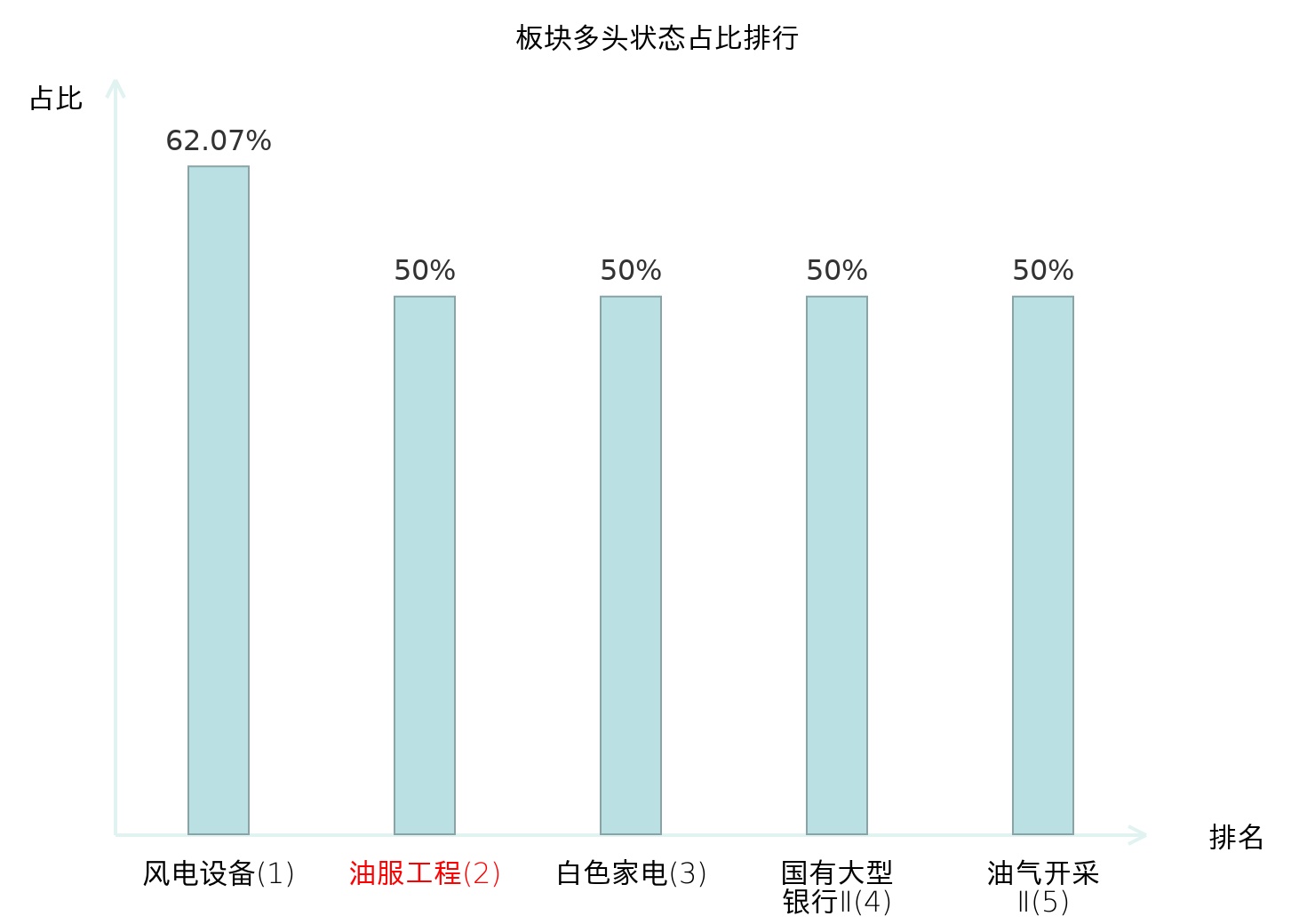 全市场所有行业板块中主力多头状态占比排名中,风电设备板块位居第一。动物保健Ⅱ板块名次提升最快,较昨日上升64位。