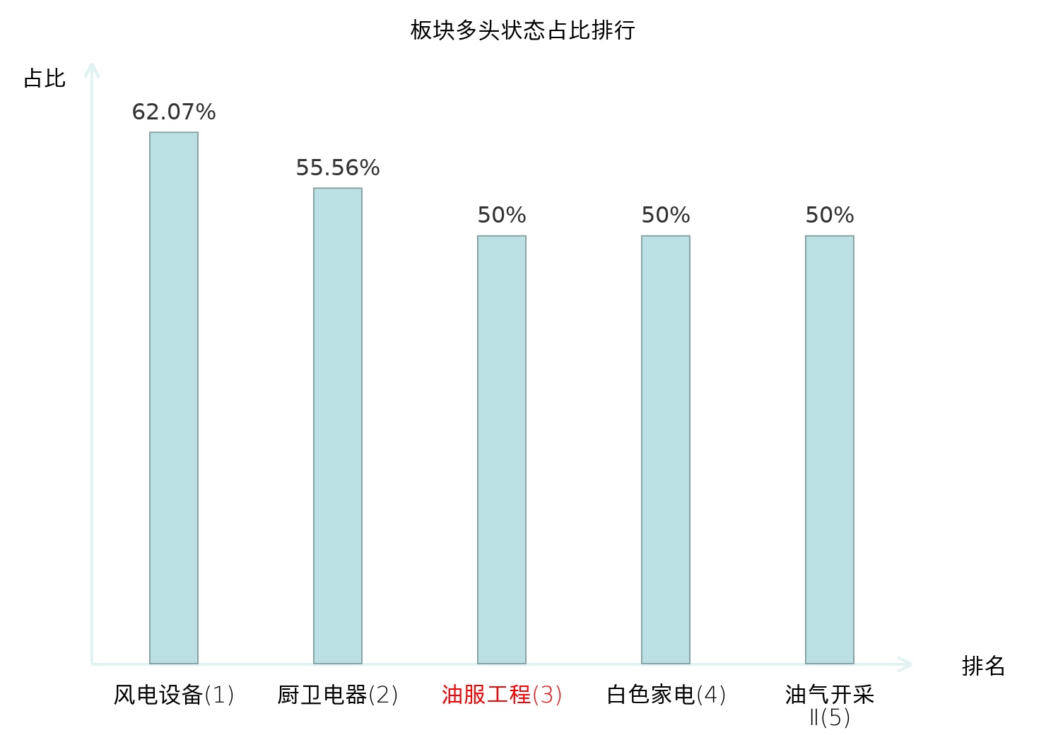 全市场所有行业板块中主力多头状态占比排名中,风电设备板块位居第一。专业连锁Ⅱ板块名次提升最快,较昨日上升65位。