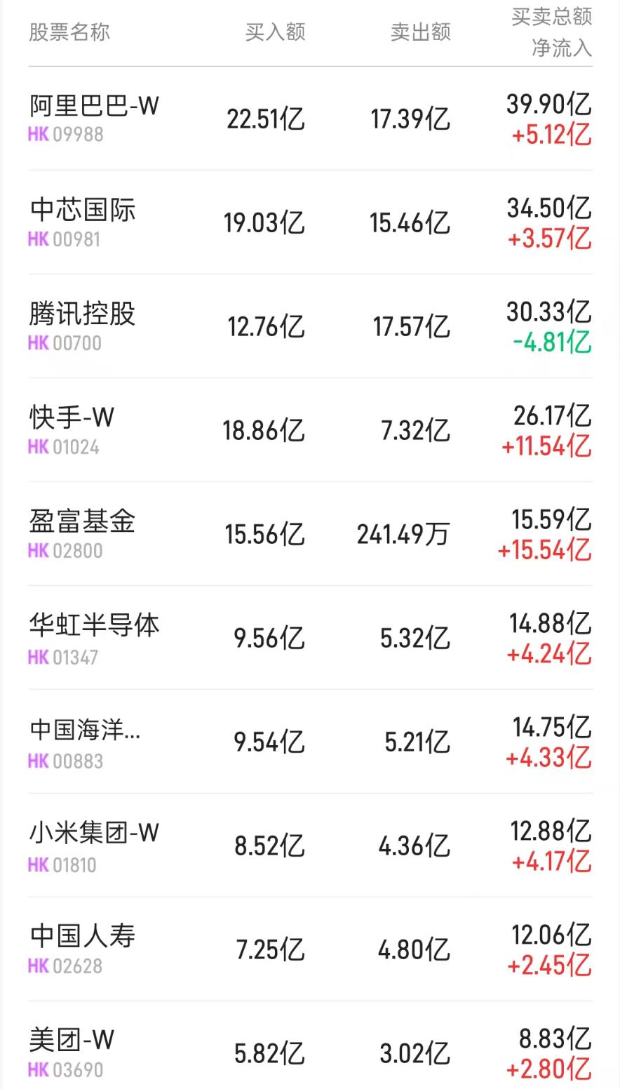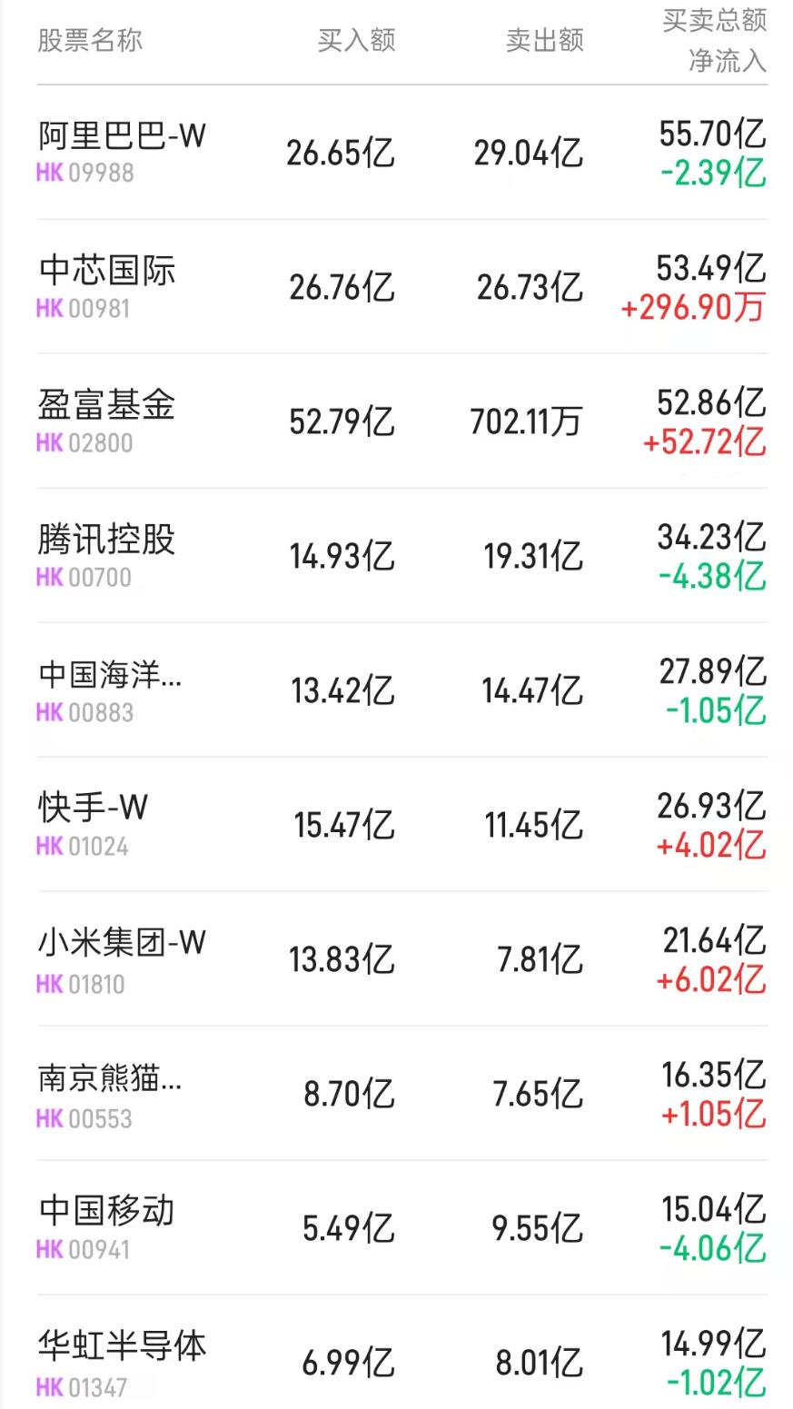 此外,美团-W(03690)、阿里巴巴-W(09988)分别获净买入2.79亿、2.72亿港元。而腾讯(00700)、中国移动(00941)分别遭净卖出9.18亿、4.06亿港元。