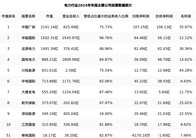 郴电国际最新报告期数据为年报,下表汇总了电力行业内市值靠前的公司年报主要经营数据