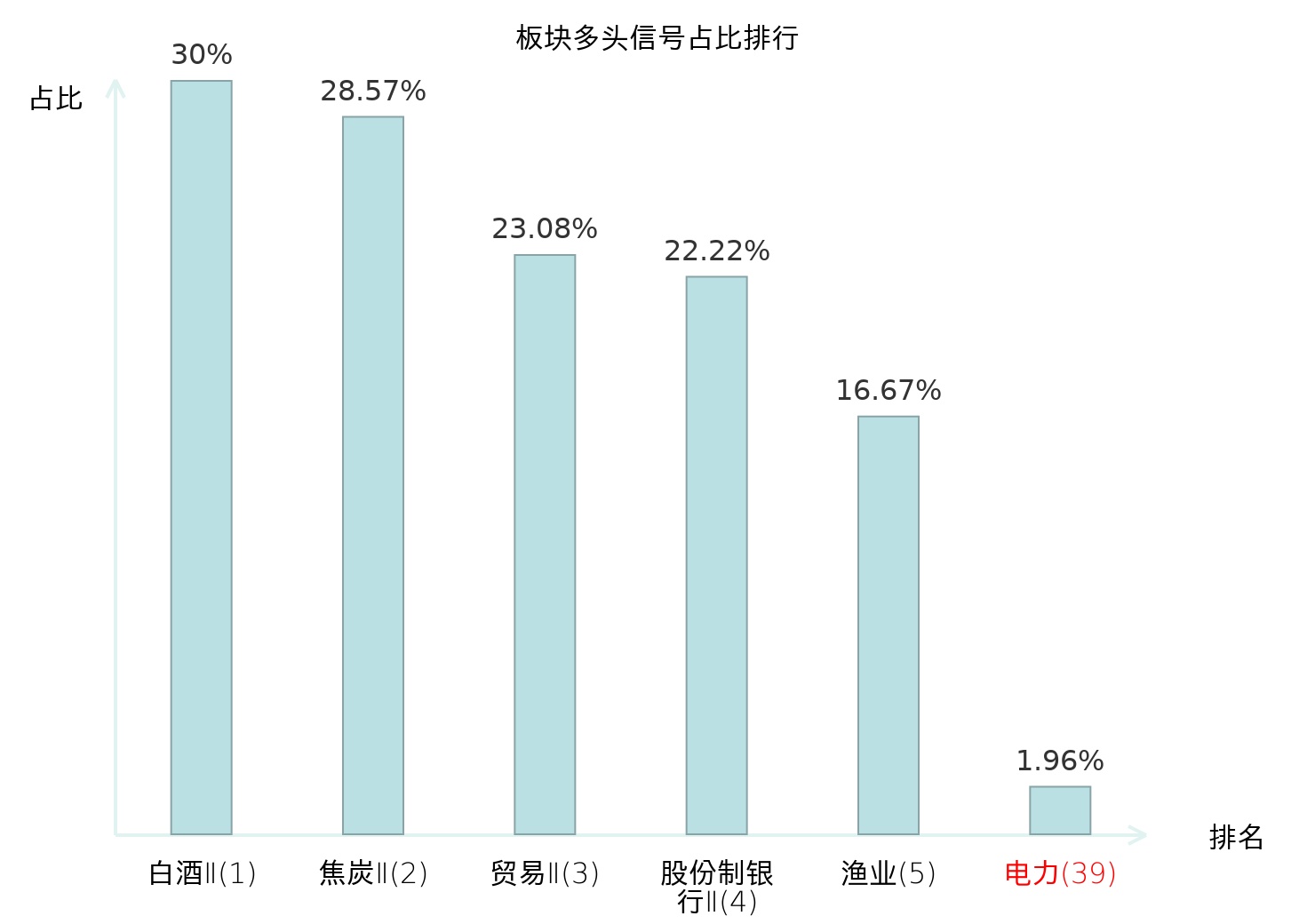 全市场所有行业板块中主力多头信号占比排名中,白酒Ⅱ板块位居第一。焦炭Ⅱ板块名次提升最快,较昨日上升119位。