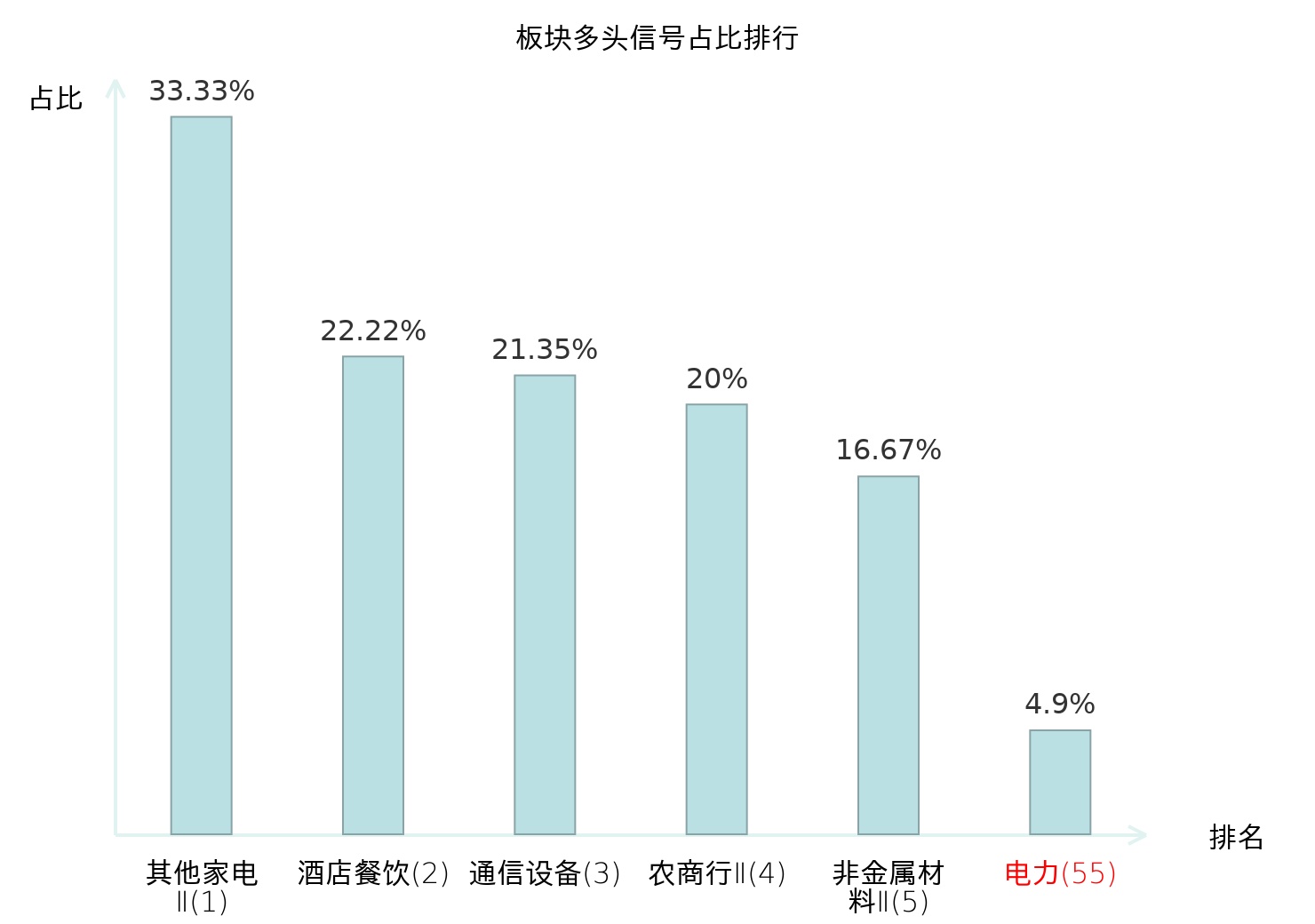 全市场所有行业板块中主力多头信号占比排名中,其他家电Ⅱ板块位居第一。其他家电Ⅱ板块名次提升最快,较昨日上升128位。