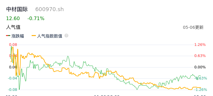 05月06日,中材国际收报12.60,股价涨幅-0.71%,成交金额2.73亿元,换手率1.23%。
