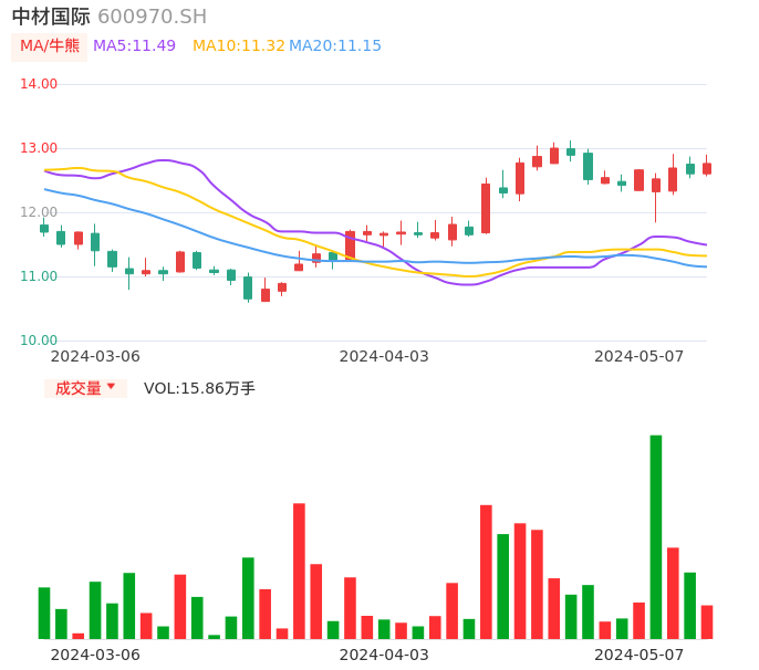 05月07日,中材国际收报12.76,股价涨幅1.27%,成交金额2.02亿元,换手率0.90%。
