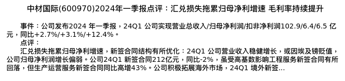 值得注意的是:2024年05月光大证券的孙伟风/吴钰洁分析师,首次发布关于中材国际的研究报告,标题为:中材国际(600970)2024年一季报点评:汇兑损失拖累归母净利增速 毛利率持续提升。