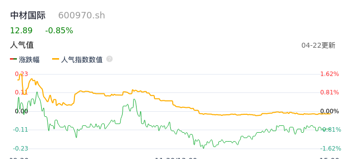 04月22日,中材国际收报12.89,股价涨幅-0.85%,成交金额2.29亿元,换手率1.01%。