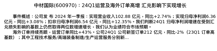 值得注意的是:2024年04月华西证券的戚舒扬/金兵分析师,首次发布关于中材国际的研究报告,标题为:中材国际(600970):24Q1运营及海外订单高增 汇兑影响下实现增长。