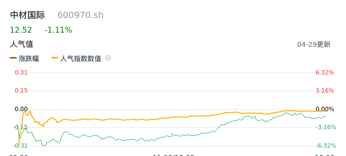 04月29日,中材国际收报12.52,股价涨幅-1.11%,成交金额5.54亿元,换手率2.59%。