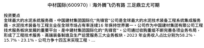 值得注意的是:2024年04月浙商证券的杨凡/吴贵伦分析师,首次发布关于中材国际的研究报告,标题为:中材国际(600970):海外腾飞仍有路 三足鼎立尤可期。