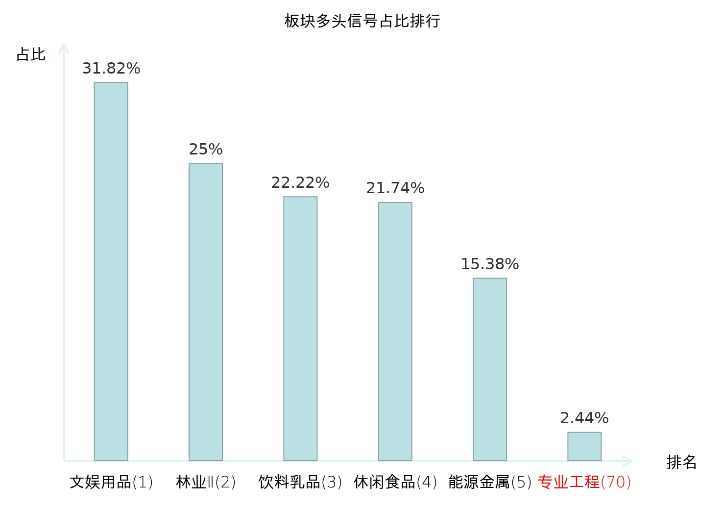 全市场所有行业板块中主力多头信号占比排名中,文娱用品板块位居第一。林业Ⅱ板块名次提升最快,较昨日上升124位。