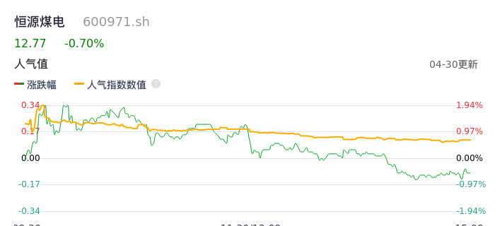 04月30日,恒源煤电收报12.77,股价涨幅-0.70%,成交金额1.57亿元,换手率1.01%。