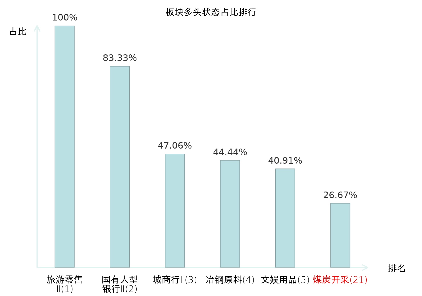 全市场所有行业板块中主力多头状态占比排名中,旅游零售Ⅱ板块位居第一。旅游零售Ⅱ板块名次提升最快,较昨日上升130位。