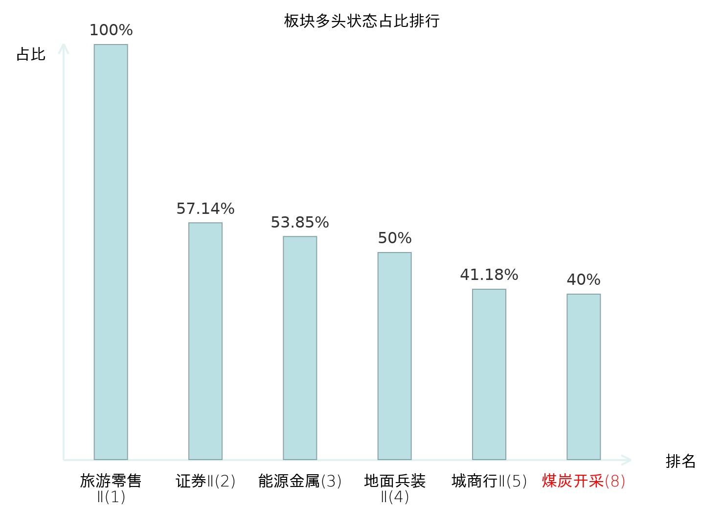 全市场所有行业板块中主力多头状态占比排名中,旅游零售Ⅱ板块位居第一。渔业板块名次提升最快,较昨日上升57位。