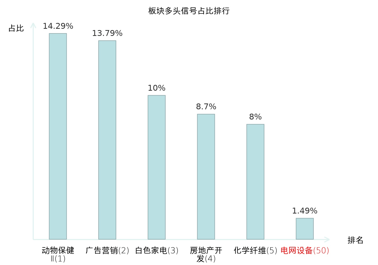 全市场所有行业板块中主力多头信号占比排名中,动物保健Ⅱ板块位居第一。动物保健Ⅱ板块名次提升最快,较昨日上升100位。