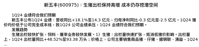 值得注意的是:2024年04月中金公司的王思洋/龙友琪/单妍分析师,首次发布关于新五丰的研究报告,标题为:新五丰(600975):生猪出栏保持高增 成本仍存挖潜空间。