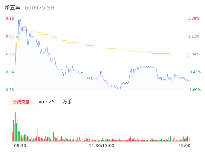 04月30日,新五丰收报8.79,股价涨幅-1.01%,成交金额2.25亿元,换手率2.90%。