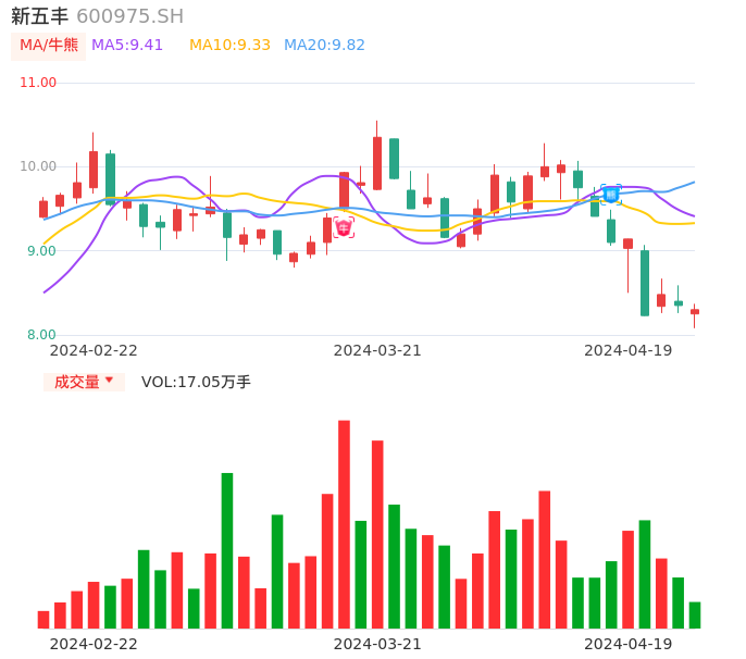04月19日,新五丰收报8.30,股价涨幅-0.60%,成交金额1.40亿元,换手率1.97%。