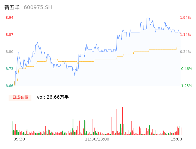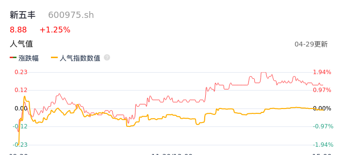 04月29日,新五丰收报8.88,股价涨幅1.25%,成交金额2.35亿元,换手率3.08%。