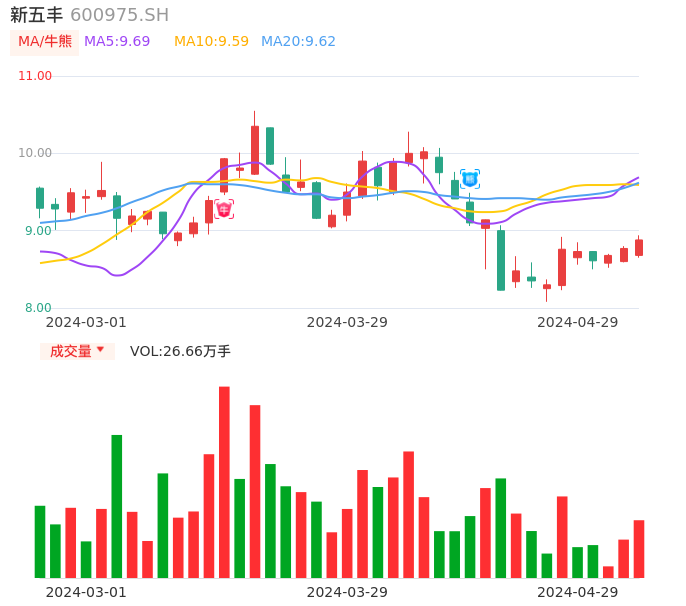 值得注意的是:2024年04月国信证券的鲁家瑞/李瑞楠分析师,首次发布关于新五丰的研究报告,标题为:新五丰(600975):业绩由于猪价低迷承压 生猪出栏稳健增长。