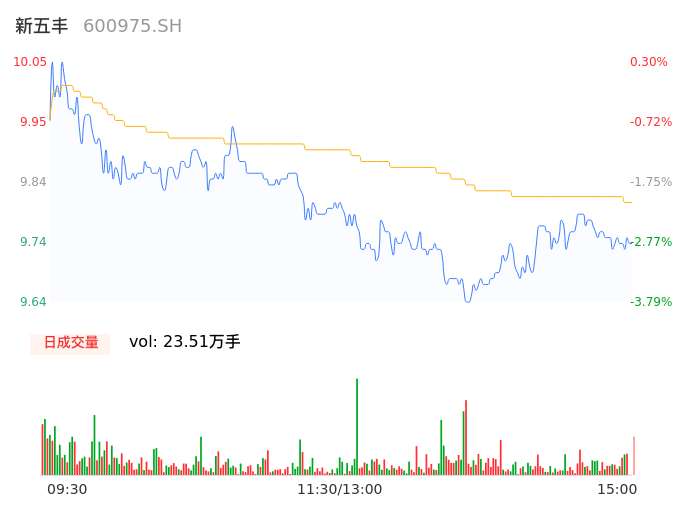 04月10日,新五丰收报9.75,股价涨幅-2.69%,成交金额2.31亿元,换手率2.72%。