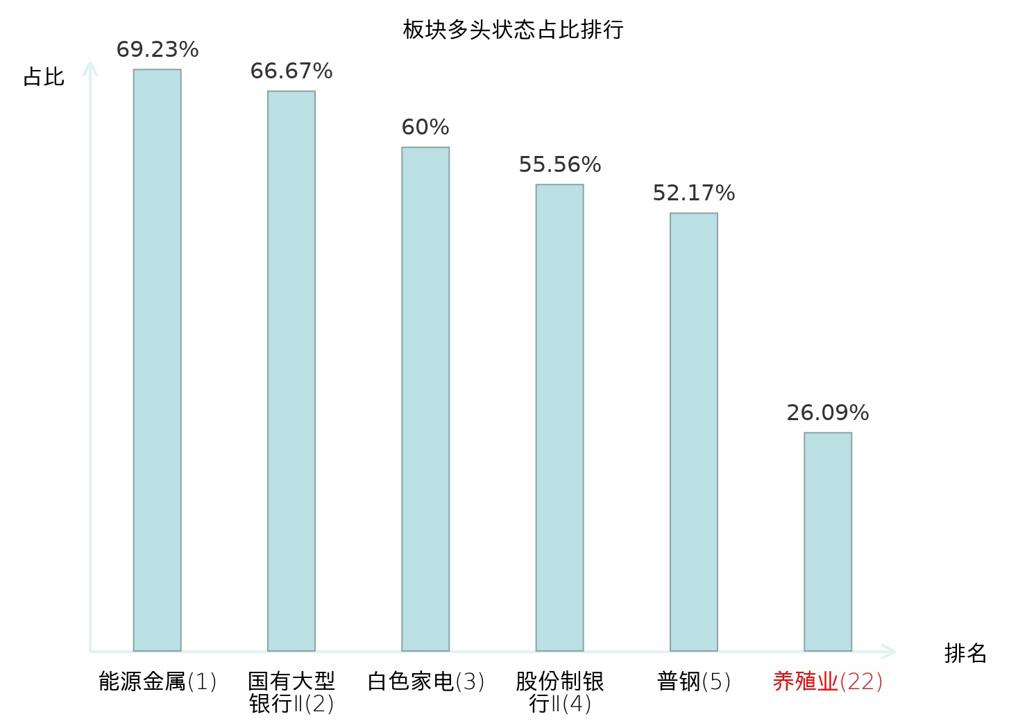 全市场所有行业板块中主力多头状态占比排名中,能源金属板块位居第一。贸易Ⅱ板块名次提升最快,较昨日上升69位。